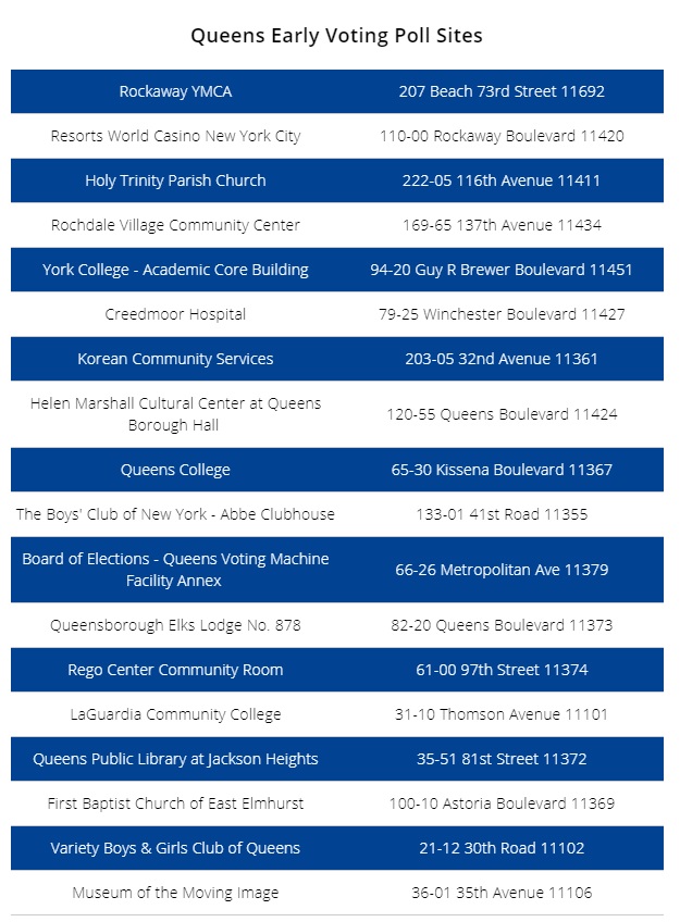 There are 18 early voting sites in Queens. Residents are not permitted to vote at any of the sites but must go to a specific location based on where they are registered.