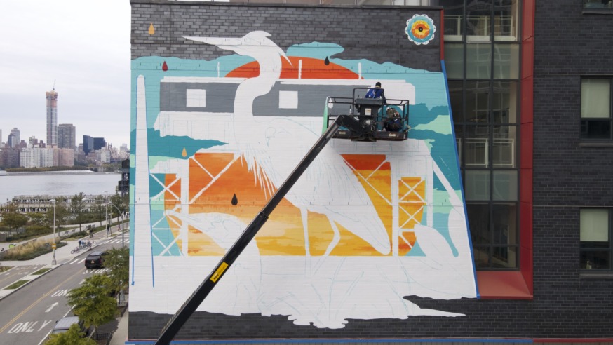 A massive mural featuring a giant heron, a cormorant and a glowing sunset is going up on a school building in Long Island City.