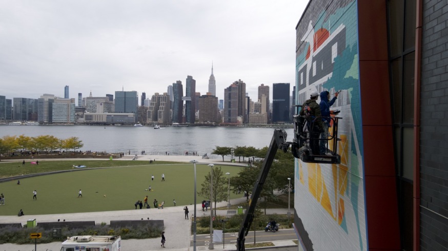 The mural is being painted on the side of the Q404 Hunters Point campus building, which is located on Center Boulevard–across the East River from the United Nations headquarters.