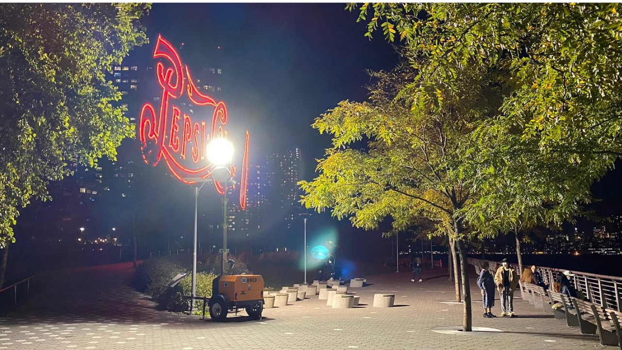 Floodlights powered by a generator in front of the Pepsi sign at Gantry Plaza State Park on Oct. 15, 2020 (Michael Dorgan, Queens Post)
