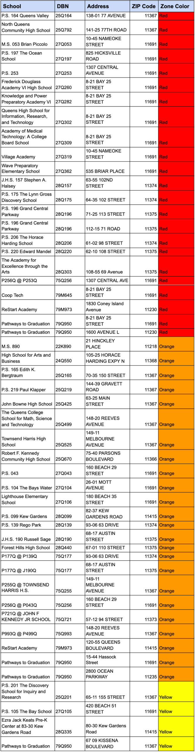 De Blasio said today that those schools will remain closed for two weeks regardless of the state’s zones.