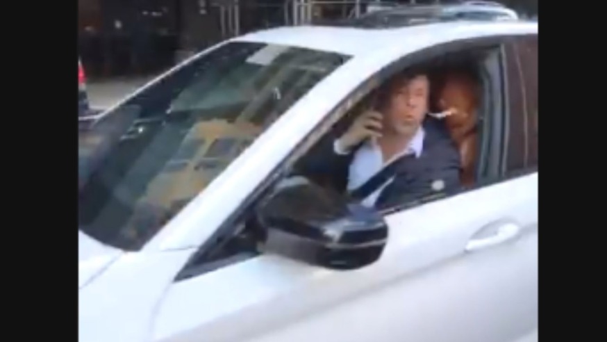 The driver is then seen in his white BMW sports car pulling out of the bike lane–before spitting out the window at the bicyclist. The driver can also be seen using a cell phone while driving.