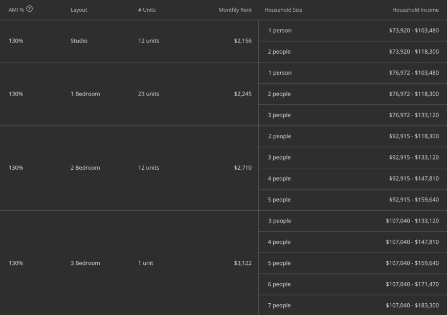 There are 12 studio units available for $2,156 a month to households of one to two people who make between $73,920 and $118,300 combined annually.