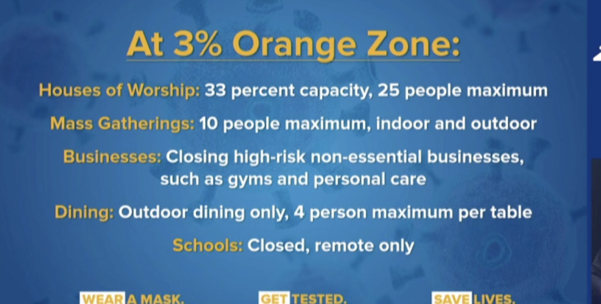 Orange zone restrictions — the midrange level among the state’s designated red, orange and yellow zones — mandate the closure of indoor dining and high-risk nonessential businesses like gyms and personal care services.