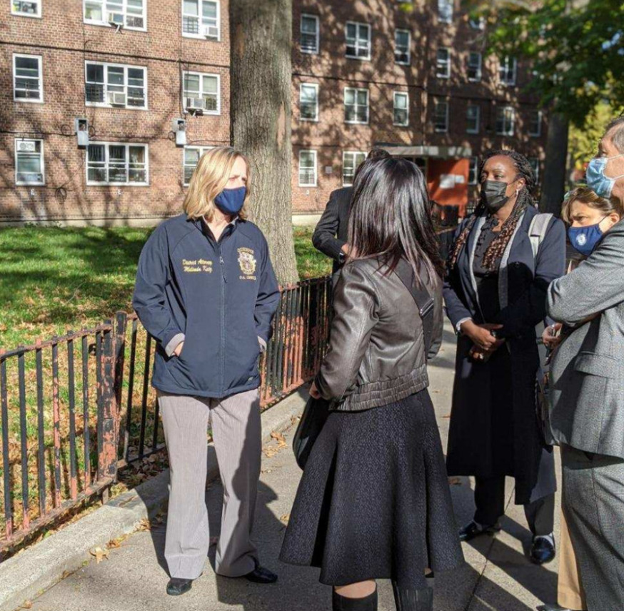 Queens District Attorney Melinda Katz with a team of investigators and staff from the Office’s Conviction Integrity Unit visiting the crime scene where a 70-year-old woman was stabbed to death in 1995 on the grounds of the Ravenswood Houses.