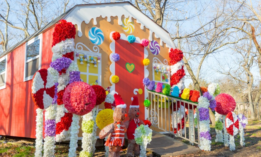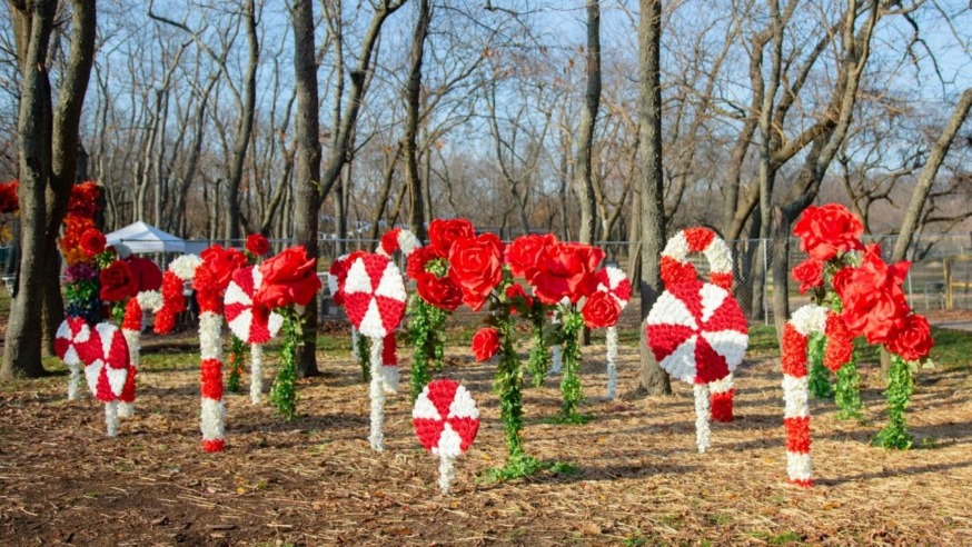 The new production, called The Winter Escape, opened on Nov. 28 and features 15 large floral installations that include a 16 foot-tall Christmas tree, a gingerbread house, a rose garden filled with candy canes and lollipops, and a 12 foot-tall arch covered in roses.