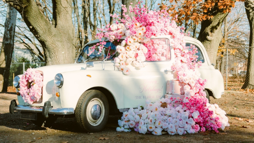 Vintage car overflowing with flowers at the Winter Escape (Provided by The Floral Escape)
