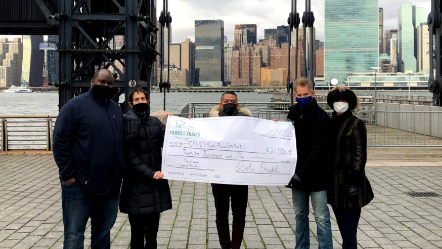 Gantry Plaza State Park Manager Andrew Williams, NYC Regional Director Leslie Wright, HPPC Vice President Mark Christie, HPPC President Rob Basch, HPPC Treasurer Babara Etzel at the check presentation at Gantry Plaza State Park on Dec. 2, 2020 (Image provided by the HPPC)