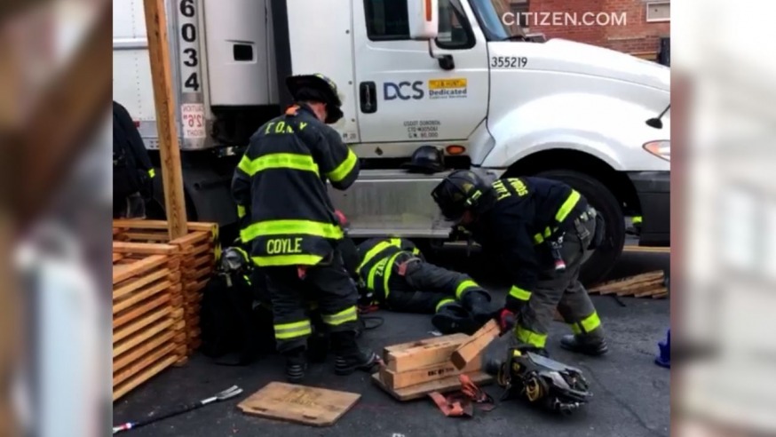 The agent, 48, remained pinned under the truck but was eventually rescued by a team of FDNY firefighters, video footage shows.