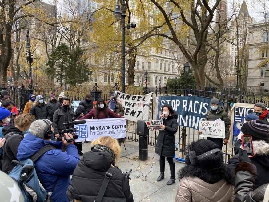 Seonae Byeon, Lead Housing Organizer at the MinKwon Center, addresses residents from across NYC in front of City Hall Wednesday as part of a new citywide campaign against luxury rezoning. (Seonae Byeon/MinKwon Center)