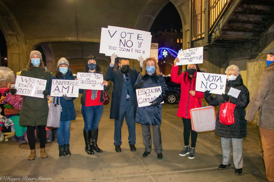 A number of residents held a rally in Sunnyside Wednesday to call on Community Board 2 and Council Member Jimmy Van Bramer to vote against a rezoning plan that would allow an affordable housing complex to go up on Barnett Avenue.