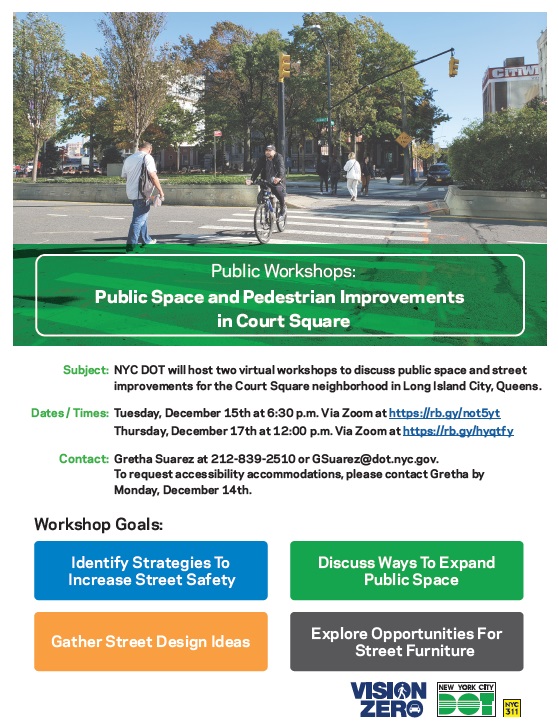 The Dept. of Transportation is holding two virtual workshops next week to discuss ways in which street safety can be improved in the Court Square section of Long Island City and how public spaces can be expanded.