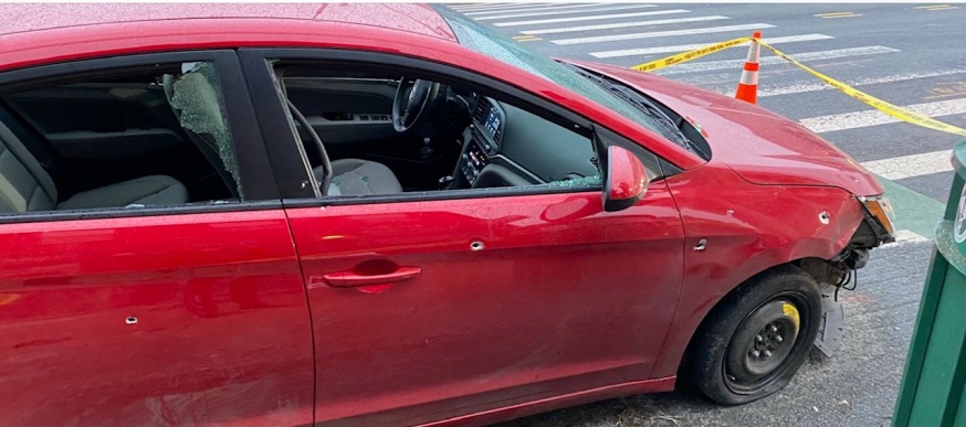 A bullet-ridden vehicle on 46th Avenue in Long Island City on New Year’s Day