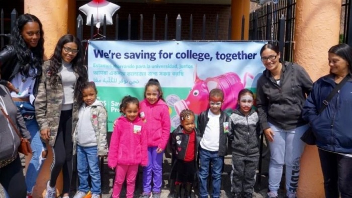Families from the Astoria Houses NYCHA complex celebrate the launch of the Save for College Program in 2018 (GoFundMe).