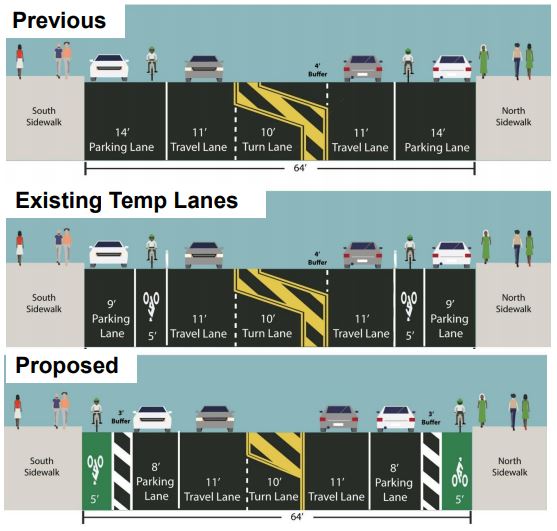 At present along Broadway, a temporary protected bike lane runs between the vehicle parking lane and the main vehicle traffic lane. The new plan would essentially switch the protected bike lane with the vehicle parking lane.