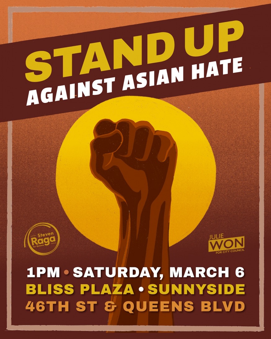 Julie Won and Steven Raga are hosting the “Stand Up Against Asian Hate” rally on Saturday, March 6 at Bliss Plaza, located at 46th Street and Queens Boulevard. The rally will begin at 1 p.m.