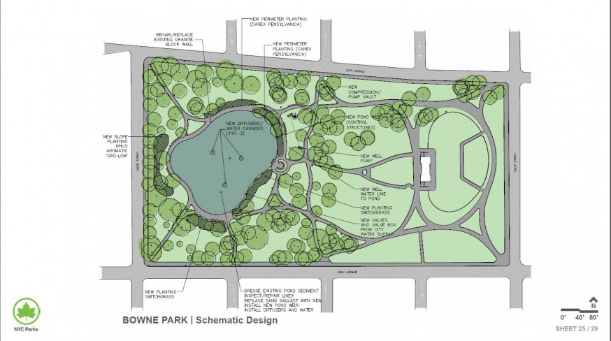 The pond area of the park, which is located on the border of Flushing and Broadway-Flushing, will undergo a major overhaul that will include an upgrade of the water fountains, the installation of new water cannons and the replacement of the granite stone wall at the edge of the pond.