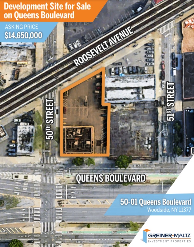 A large piece of property that fronts both Roosevelt Avenue and Queens Boulevard has hit the market with an asking price of $14,650,000.