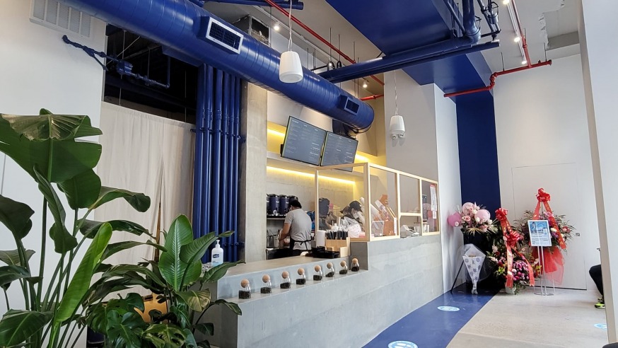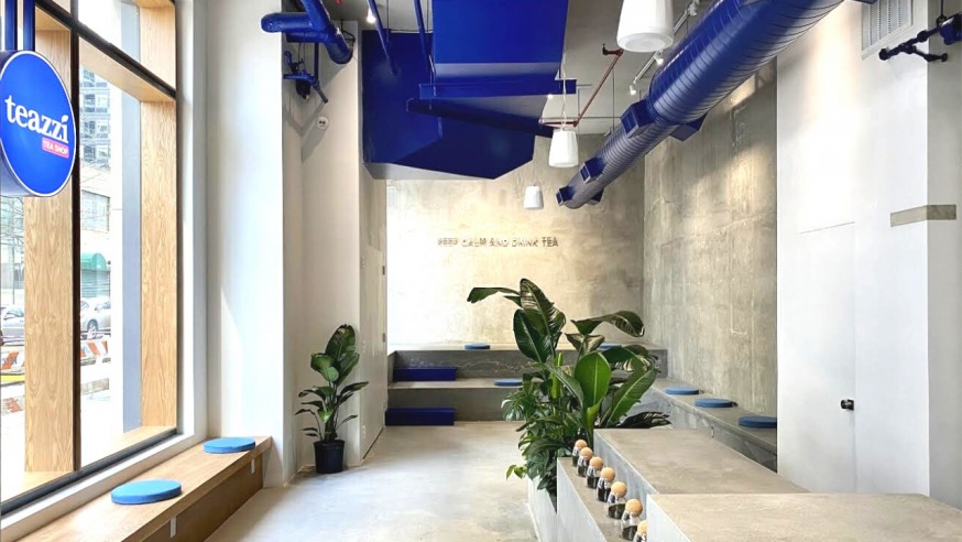 The shop has a high ceiling and exposed ductwork that is painted blue (Photo: provided by Teazzi Tea Shop)
