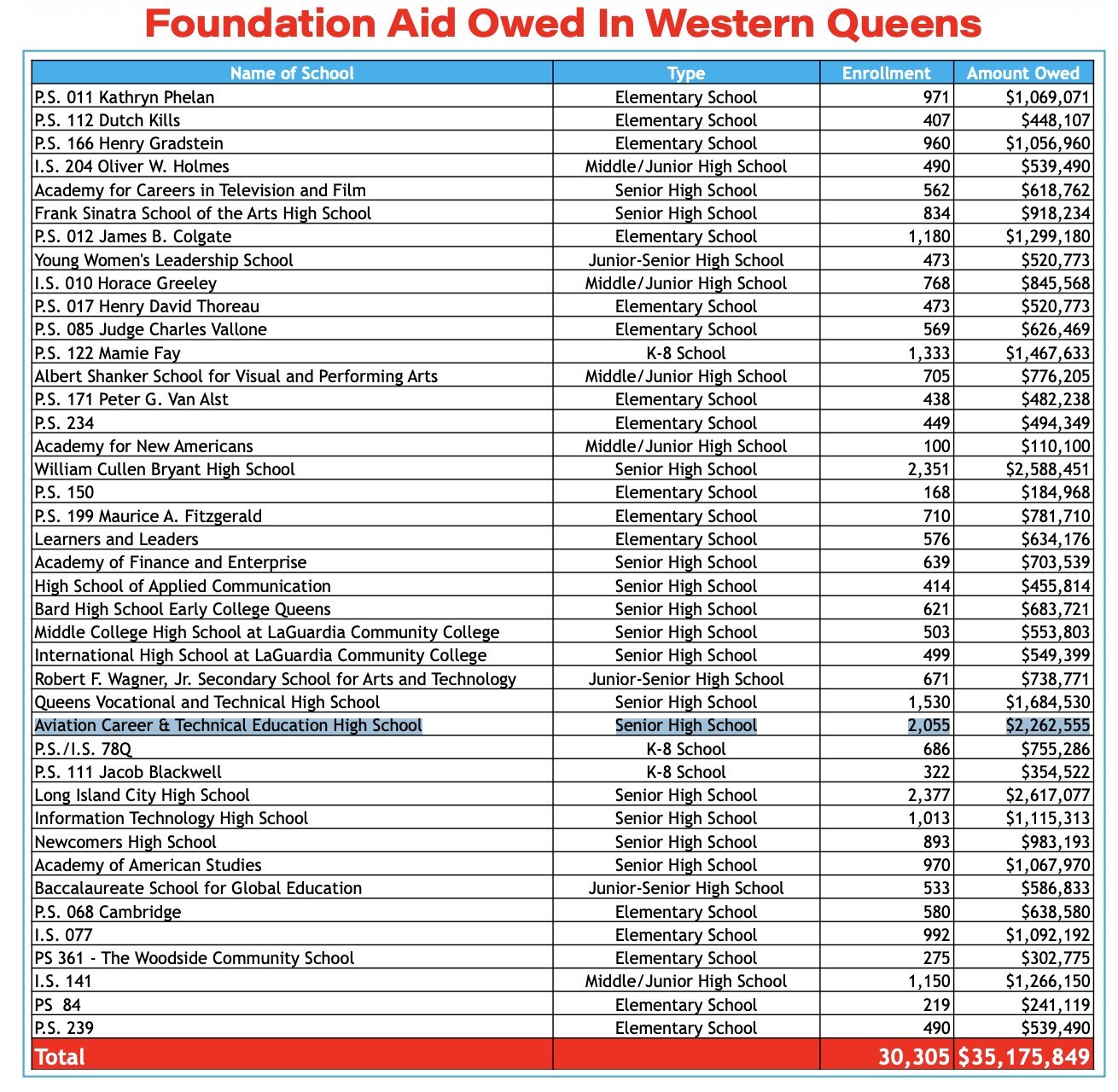 Long Island City High School is expected to receive the most Foundation Aid — an estimated $2,617,077 — among the 41 schools, followed by William Cullen Bryant High School with $2,588,451 and Aviation Career & Technical Education High School with $2,262,555.