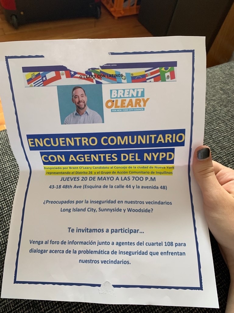 She said the flyers—which were in Spanish only— raised alarm bells. She felt it was inappropriate for uniformed on-duty NYPD officers to participate in a candidate’s event at their campaign office.