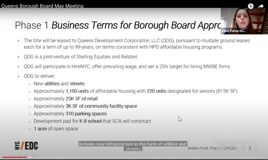 The plans for Phase 1 of the Willets Point redevelopment presented by Jana Pohorelsky, the EDC’s assistant vice president for Government & Community Relations (screenshot)