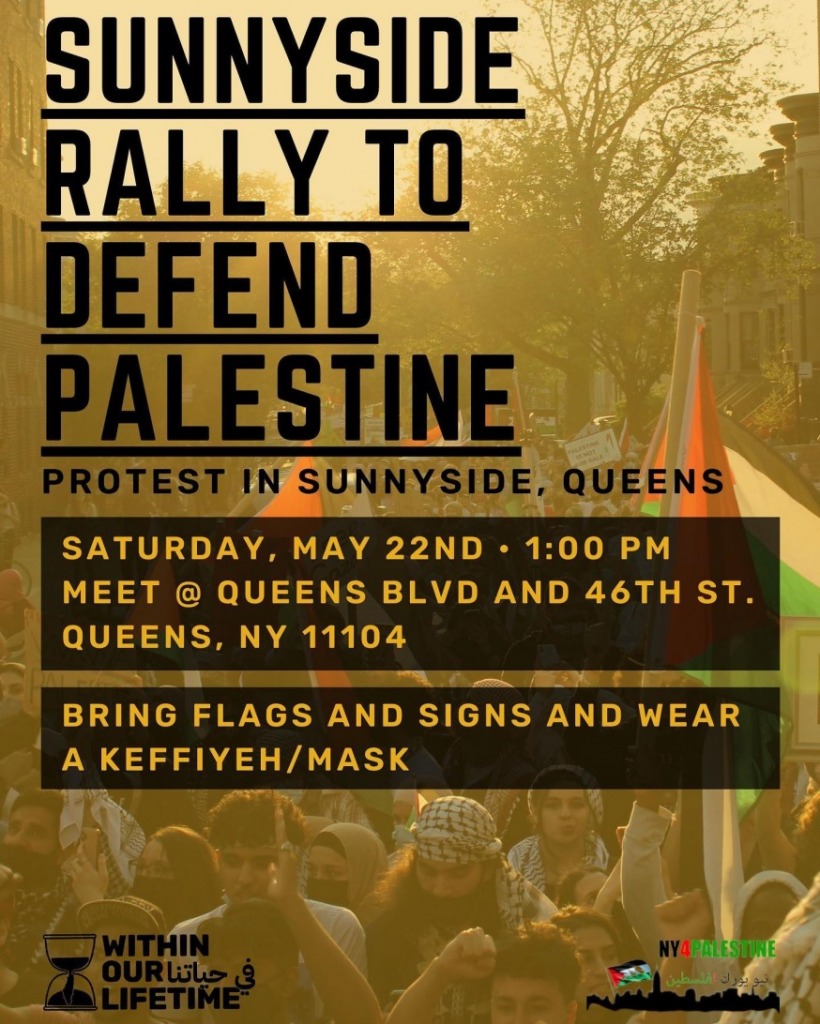 ?NYC ALL OUT FOR PALESTINE?THIS SATURDAY 5/22 @ 1:00 PM. QUEENS BLVD AND 46TH STREET, SUNNYSIDE QUEENS! #DefendPalestine #SaveSheikhJarrahh pic.twitter.com/6SZ5sF183W