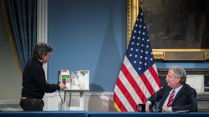 Mayor Bill de Blasio announcing of a new line of bridge ventilators at City Hall in April 2020. Photo Credit: Ed Reed/Mayoral Photography Office