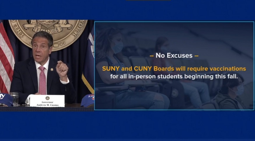“No excuses,” Cuomo said during a press briefing. “SUNY and CUNY boards will require vaccinations for all in-person students coming back to school in the fall.”