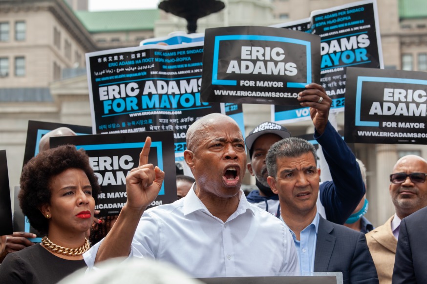 Mayoral candidate and Brooklyn Borough President Eric Adams held a campaign rally in front of his office on Wednesday, June 2, 2021. | Ben Fractenberg/THE CITY