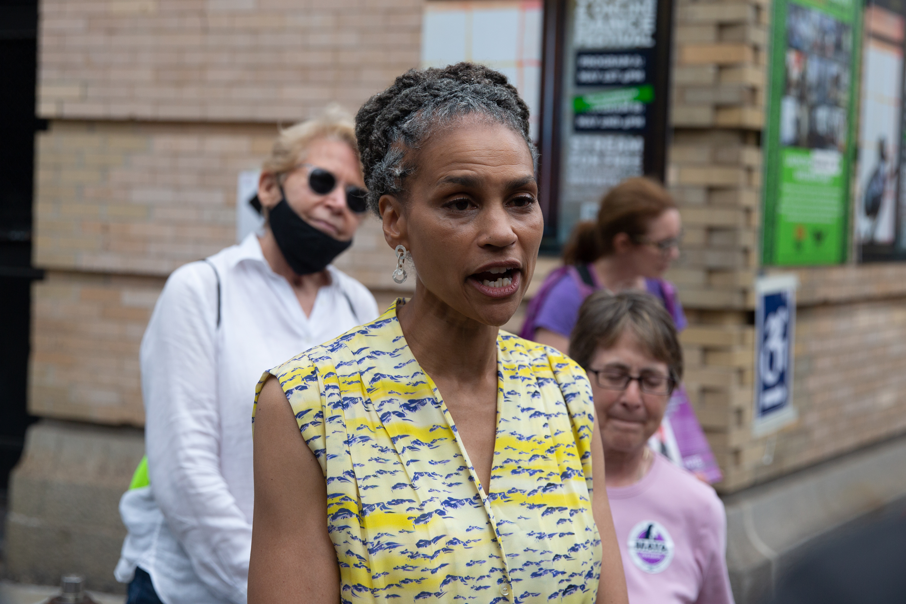 Ben Fractenberg/THE CITY Maya Wiley greets votes at a West Village polling site.