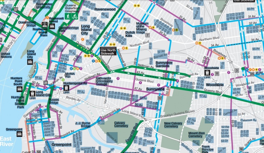 NYC Bike Map. 2021 (Green=protected bicycle lanes, Blue= conventional bicycle lanes, Pink=shared bicycle lanes). Transportation advocates want a safer bike network from 34th Avenue in Jackson Heights through to Skillman Avenue in Sunnyside