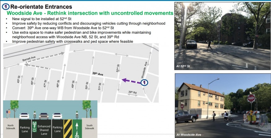 The DOT also plans to convert 39th Avenue from Woodside Avenue to 52nd Street into a one-way zone—west bound. The DOT says that the change would lead to a reduction in speeding, and create additional space for a protected bicycle lane and pedestrian safety features.