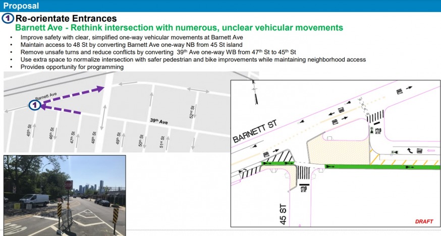 The DOT plans to convert 39th Avenue between 45th and 47th streets (currently two-way) into a one-way street going west. It also plans to convert Barnett Avenue—between 45th and 48th streets—into a one-way street going east. Currently that section of Barnett Avenue is a narrow two-way street.