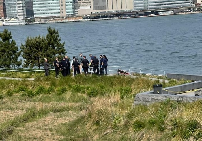 Police at Hunters Point South Park on May 26 near where a man’s body was found in the East River (Photo: Courtesy of Hunters Point South Waterfront Residents Facebook page)