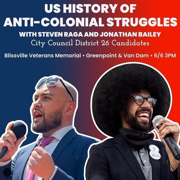 A conversation on the US history of anti-colonial struggles with District 26 Council Candidates Steven Raga and Jonathan Bailey. (Photo: Instagram)