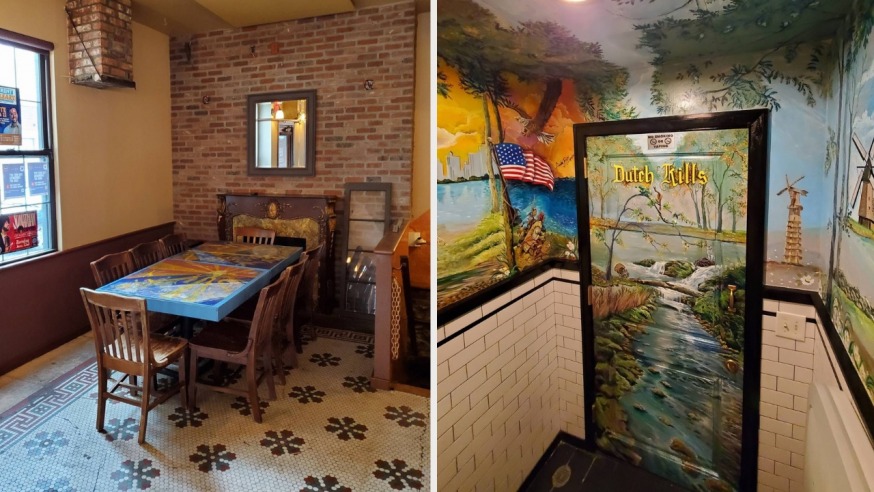 The interior walls have been painted in a light sand color with dark brown trims. A mural has gone up on the walls of the gender-neutral bathroom that features landmarks associated with the neighborhood. New York-based artist Linda Rufo carried out the redecorations.