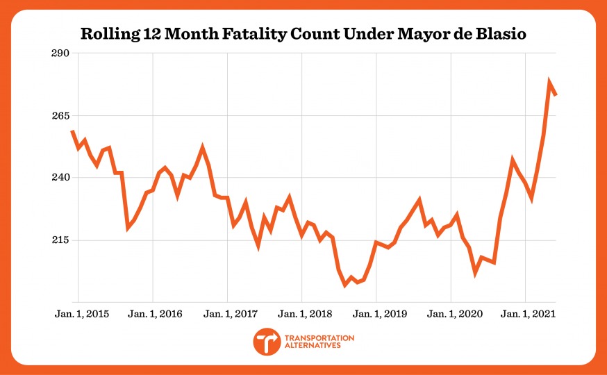 2021 is on track to be the deadliest year in terms of traffic fatalities since Mayor Bill de Blasio took office in 2014, according to a new report.