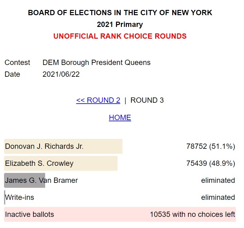 Richards’ lead increased once again when the third candidate in the race—Jimmy Van Bramer—was eliminated and Van Bramer’s second choice votes were tabulated.