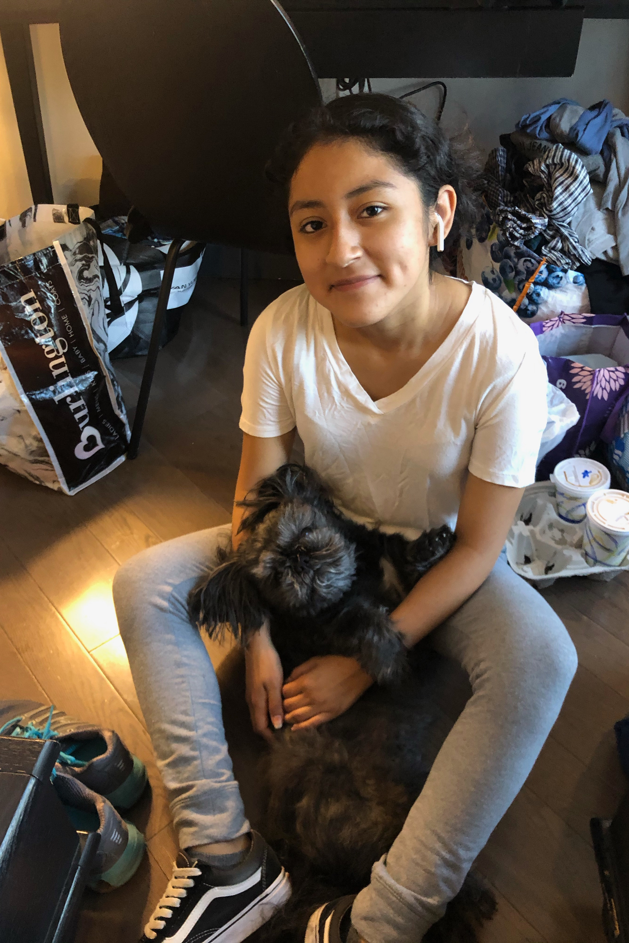 16-year old Kimberly Sinchi has been staying with her dog, Tango, and her parents at a hotel room in downtown Brooklyn after they were displaced by a fire from their Jackson Heights apartment. Courtesy of Kimberly Sinchi