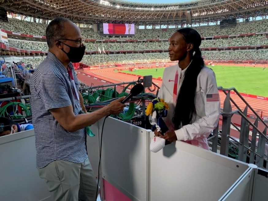 Lester Holt speaking to Dalilah Muhammad post race. Muhammad will be featured alongside McLaughlin on tonight’s NBC Nightly News with Lester Holt which airs at 6:30 p.m.(Photo courtesy of NBC Nightly News with Lester Holt)