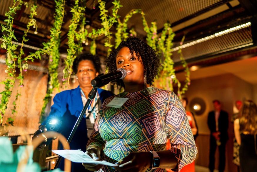 Dr. Shani Andre, Vice President and Chief Medical Officer of The Floating Hospital giving an acceptance speech on behalf of the organization. Cynthia Davis, Director of Community Outreach for The Floating Hospital, is behind her (Photo Courtesy of the LIC Partnership)