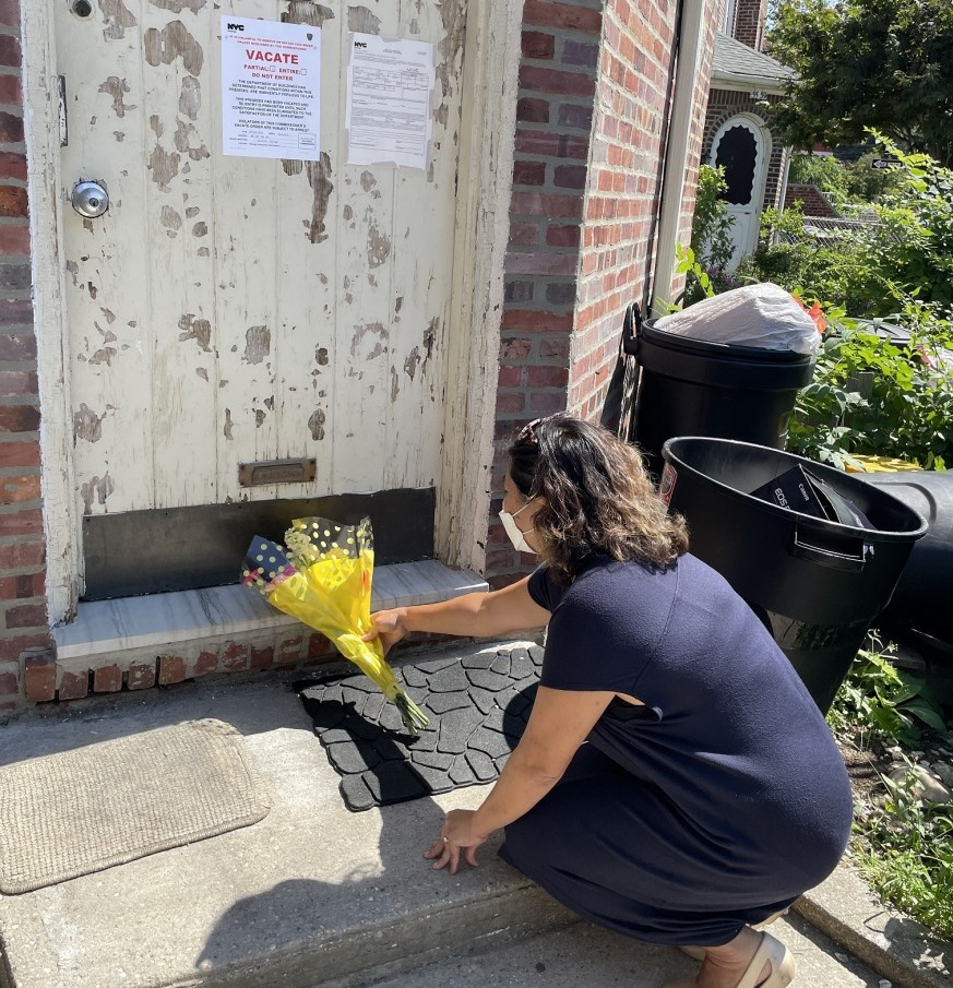 Congress Member Grace Meng lays flowers outside the door of an Elmhurst home where 86-year-old Yue Lian Chen drowned in her basement apartment (Congress Member Grace Meng)