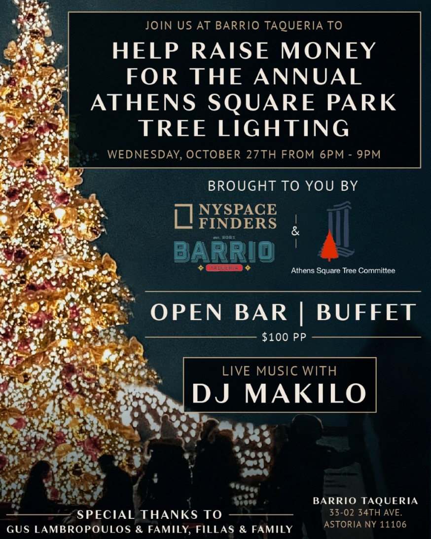 A group of Astoria business owners and a non-profit are putting up a Christmas tree in Athens Square Park once again this year—and are hosting a fundraising event on Wednesday, Oct. 27 to raise funds for the initiative.