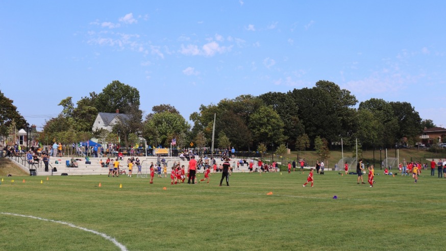 The Parks Dept. has put down a new grass surface and installed goal posts, netting, a scoreboard as well as concrete stadium seating.