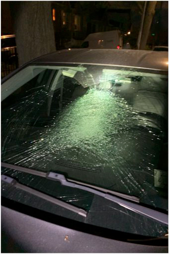 A rioter shattered a car windshield in Middle Village Friday night (Courtesy of Council Member Robert Holden’s Office)