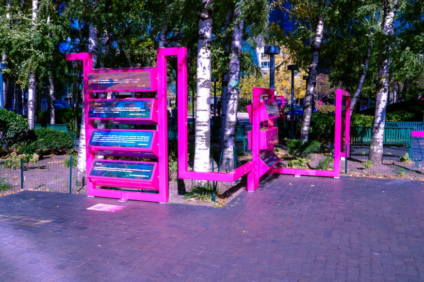Each location features two zig-zagging magenta structures with rotating panels that are inscribed with “LIC Love Notes,” notes written about the neighborhood and submitted by local residents and visitors.