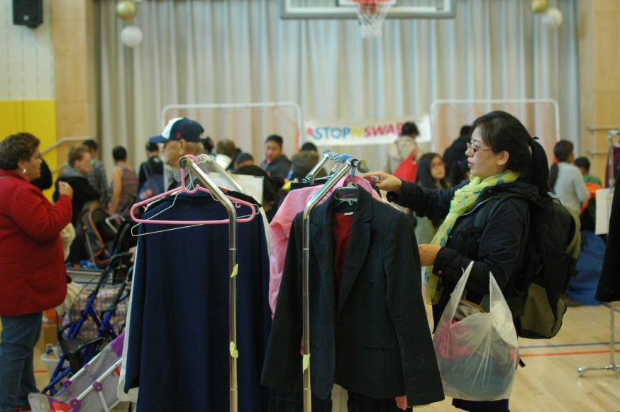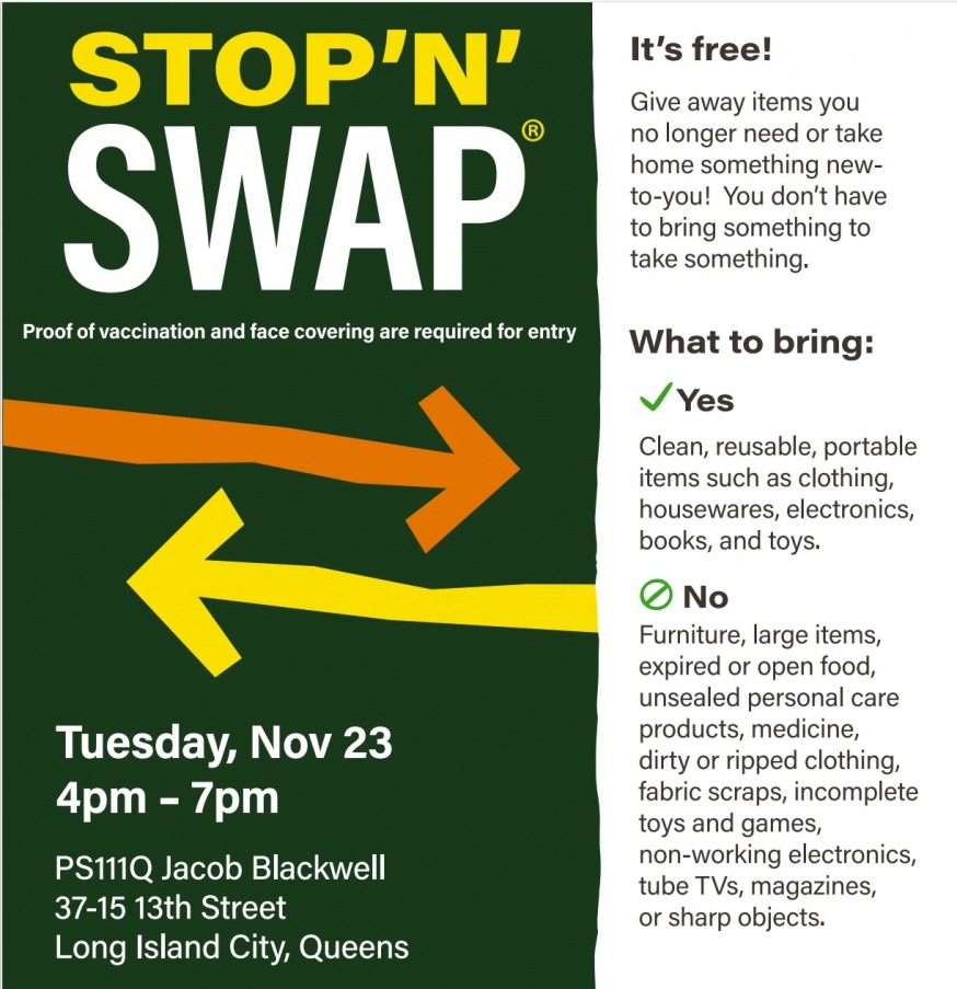 The “Stop ’N’ Swap” community reuse event, organized by the non-profit GrowNYC, allows the public to bring clean, portable, and reusable items to share with others who can use them. Items include clothing, housewares, games, books, and toys.