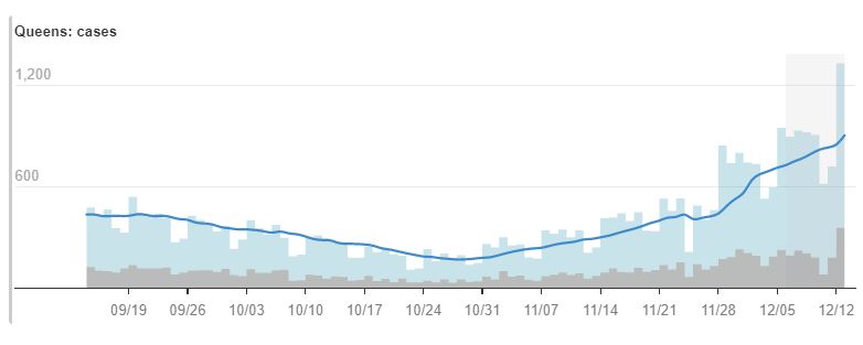 The number of coronavirus cases in Queens has spiked in recent weeks with the 7-day average in the World’s borough rising from 411 on Nov. 25 to 905 on Dec. 13.
