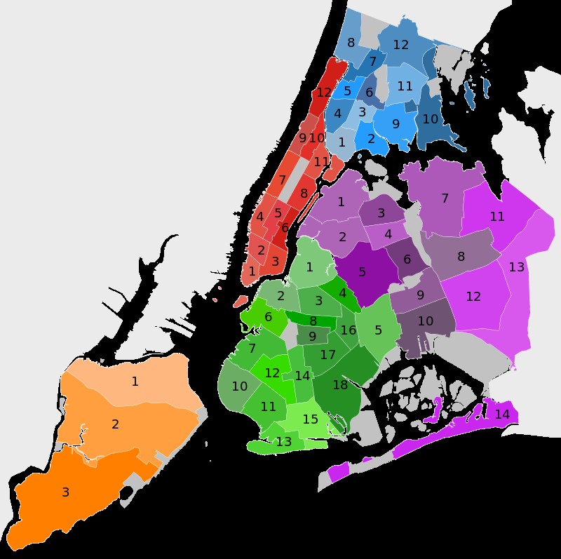 The Community Board Districts in NYC. There are 14 in Queens, which are represented in purple (NYC)